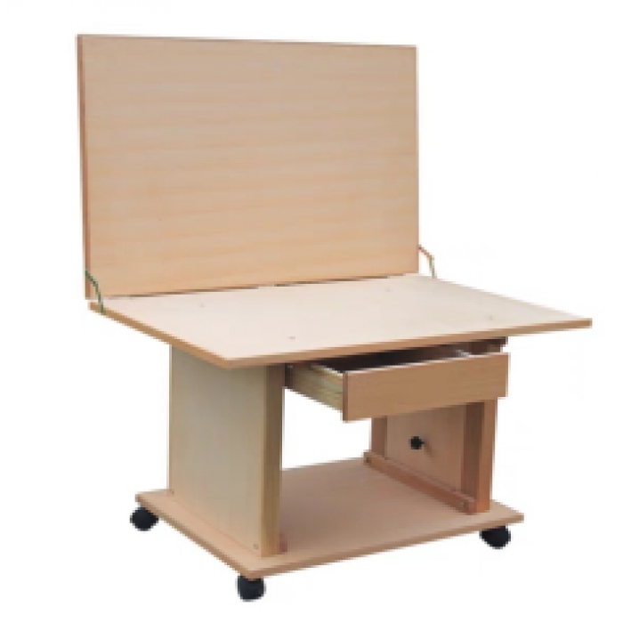 客户需求:尺寸:600mm*900mm,最大高度120cm,台面逐级升降,可根据需求自由调节高度,可折叠台面,表面光滑无颗粒,采用榉木三合板作为台面,经打磨抛光处理,整体喷涂绿色无污染清漆,配备带锁万向轮,可放置使用过程中移动,底部储藏式抽屉空间最大化,方便放置画笔,颜料等