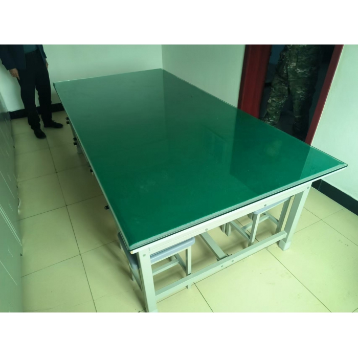 客户需求:尺寸2400*1200*760mm 1.基材:采用E1级优质刨花板,台面厚度25mm; 2.饰面:采用优质防火板,人体接触面鸭嘴边台面; 3.桌面配置:①.配置一块与桌面大小相同的10mm厚钢化玻璃一块;②.配置一块与桌面大小相符的绿色台泥。 4.封边:采用PVC封边处理,厚度为1.5mm; 5.桌架:采用50*50*1.5mm钢制方管制作,横撑采用50*50*1.0mm钢管制作; 6.抽屉采用1.0mm冷轧钢板制作。 7.颜色:浅灰色;