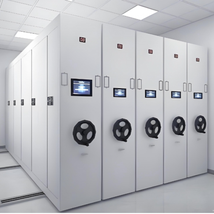 58、智能档案密集架可连接电脑控制,固定列带≥12 寸电容触摸屏幕,可在固定列上输入账号和密码、人脸、手势密码等进行身份信息验证;移动列采用≥8 寸触摸屏。可手动、电动、电脑等控制功能于一体,可实现开架、停止、左右移动、查询、 自动通风、闭架等操作,电路及控制系统故障自检功能,温度、湿度监测功能 ,红外线感应,人体安全保护功能,过道灯光自动照明功能 ,电机安全保护,语音播报功能(电动开关架体语音同步提示),独立列号显示灯, 自动记录功能,催还功能,网络管理功能、系统操作设置,档案管理查询录入等。