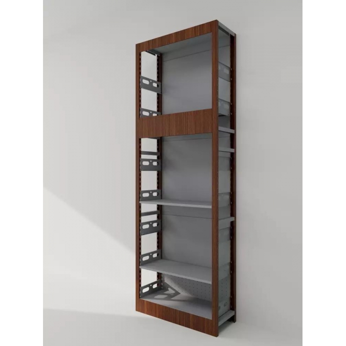 客户需求:7层,钢制部分立柱壁厚1.2mm,隔板侧板厚1.0mm,背板厚0.7mm ,1.尺寸不含装饰木板厚度, 2.背板最底层需要透气孔,其余部分,不需要透气孔, 3.书架背后需要L型防倾倒装置, 3.钢制部分,灰色(客户已提供色板) 正面立柱,顶班,地板,中间部分挡板,木质装饰板,颜色黄樱桃, 4.主架,副架数量,标注清楚, 5.其他钢架部分,与样品一致。