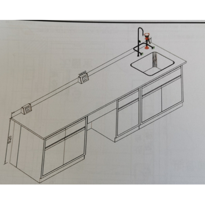 客户需求:1.1 边台 结构要求:采用全钢落地结构,实验室专用家具设备的材料及其配套件性能、技术及其安装位置应满足招标人提供的有关文件和设计图纸要求。要求实验台满足SEFA 8M-2016标准。最大荷重:落地式底柜柜体荷重性能检测: 907.2公斤;落地式底柜柜体集中荷重性能检测:90.718公斤;框架式底座框架荷重性能检测:270公斤;门片及铰链荷重性能检测:90公斤;抽屉开启荷重性能检测:68公斤,抽屉开关5万次;底柜层板荷重性能检测:90公斤/平方。 1.2 台面 采用实验室专用同色透心厚19mm的陶瓷台面;耐强酸、强碱、强有机溶剂等各种化学试剂,耐刮磨,耐1350℃以上极限高温,抗明火,抗污染,抗菌,抗变形,经久耐用,无需维护,安全环保。外侧截面均可上釉且耐腐蚀、易清洁、不着色、不脱落、不变色、耐刮磨;(1)台面抗破坏性载荷48小时不低于400kg。(2)侧面封釉:陶瓷台面的切面封釉要求,耐98%浓硫酸,40%氢氧化钠和400℃的高温。(3)抗菌性:符合国家标准JC/T897-2014《抗菌陶瓷制品抗菌性能》要求通过抗大肠埃希氏菌、黄色葡萄球菌检测。(4)陶瓷台面表面耐刻划达到国家检测标准1级。(5)莫氏硬度:参照JC/T872-2000检测标准,检测结果为6级。(6)抗釉裂性:参照GB/T3801.11-2006检测标准,检测结果为无釉裂。(7)抗落球冲击:参照GB/T26696-2011的检测标准,检测结果为无裂痕和破损。(8)弯曲弹性模数:参照GB/T26696-2011的检测标准,检测结果为无弯曲。 1.3 柜体 基材采用1.0mm首钢冷轧钢板;基材经激光切割数控冲折焊接而成,焊接部分打磨、抛光,平滑过渡处理,焊点无毛刺及假焊;整个柜体门及抽屉面板处于同平面,柜体深度为550mm,高度(含调整脚及台面厚度)为850mm (±2%);背板为可拆卸活动形式,方便拆卸,检修管路。 服务通道:中央台背对背柜体中间空档及靠边桌柜体与墙面中间空档具有服务通道距离,用来布设电、水、气管路,隐藏式设计。层板:柜体内有层板上下调节孔,孔距为20mm,每个底柜设活动层板一块。抽屉:抽屉面板为双层结构,抽屉斗长度为450mm,方便拆卸。门板:门板为双层结构,夹层内具消音材料;门板配置门扣组及缓冲垫。踢脚:踢脚与柜体为组装结构,踼脚凹入部分位于柜体正面下方,为高100mm、深50mm。 1.4 五金配件 隐藏式合页:采用直径5mm304不锈钢棒隐藏式不外露合页,防腐性能好,承重为性能强,门开启任何角度均可承重120kg以上,开启角度可达135°,启闭无噪音,防腐耐用。美式导轨:采用厚2.0mm及以上钢制高承载导轨,为冷轧钢板模具冲压成型制作,自闭结构设计,表面经环氧树酯粉末静电喷涂,当抽屉关到末端时有自闭功能,滑轨抽屉能抽出至少330mm;抽屉的滚轮采用尼龙包边的滚球轴承;不得使用滚珠导轨;C型拉手:采用高强度不锈钢把手或铝合金把手;地脚:镀锌钢地脚或橡胶地脚,可根据室内地坪适当调整柜体0-35mm的高度;门扣组:采用塑料材质的滚轮,镀锌钢材质的滚轮支架;以钢制尖头镀锌自攻螺丝与柜体及门板固定;层板支撑扣:不锈钢材质。