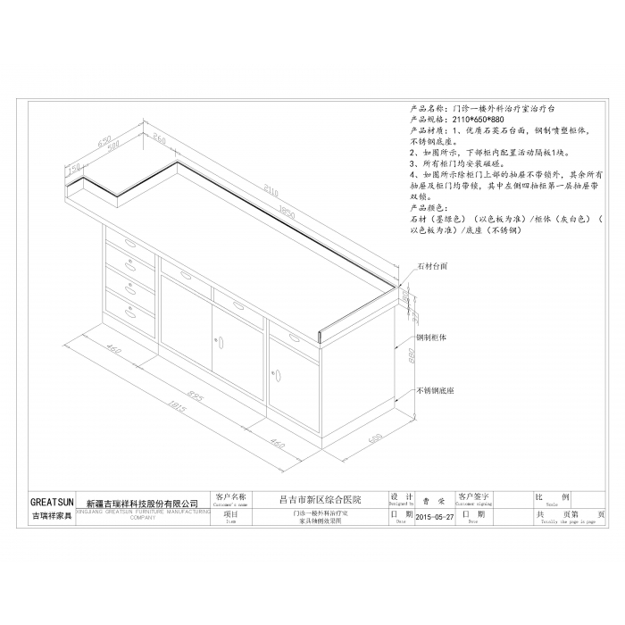 7111930,尺寸:2110*650*880,材质:钢制1.0mm柜体,12mm厚人造石英石,颜色:浅灰、中国黑