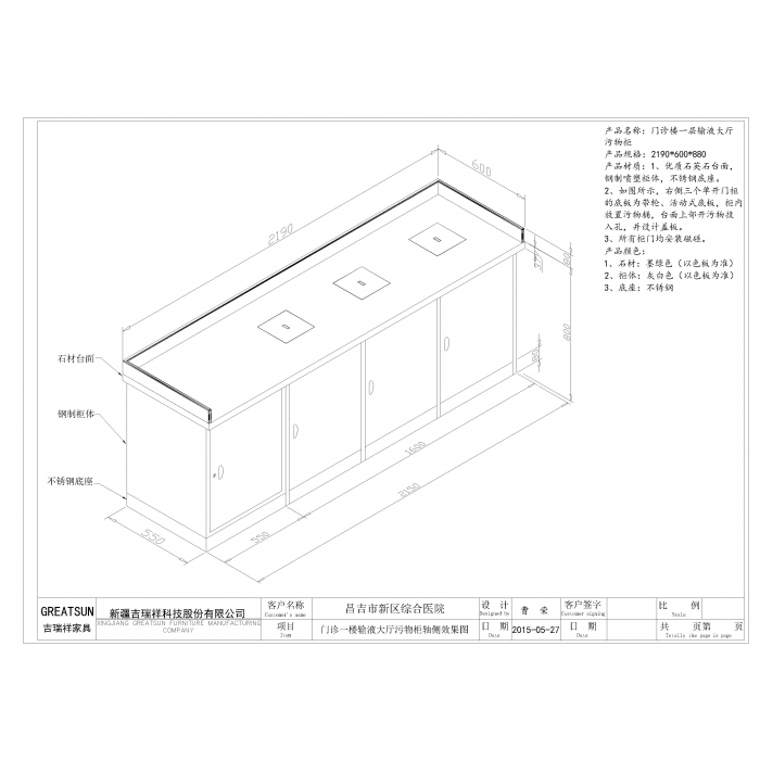 7111931,尺寸:2190*600*880,材质:钢制0.8mm柜体,12mm厚人造石英石,不锈钢裙边,颜色:浅灰、中国黑