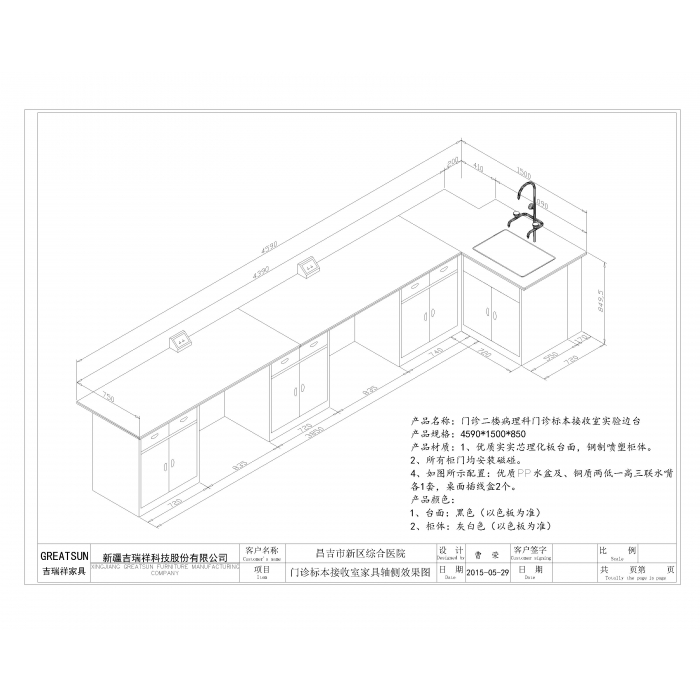 7111935,尺寸:4590*1500*850,材质:钢制1.0mm柜体,优质实心理化板台面,颜色:浅灰、黑色