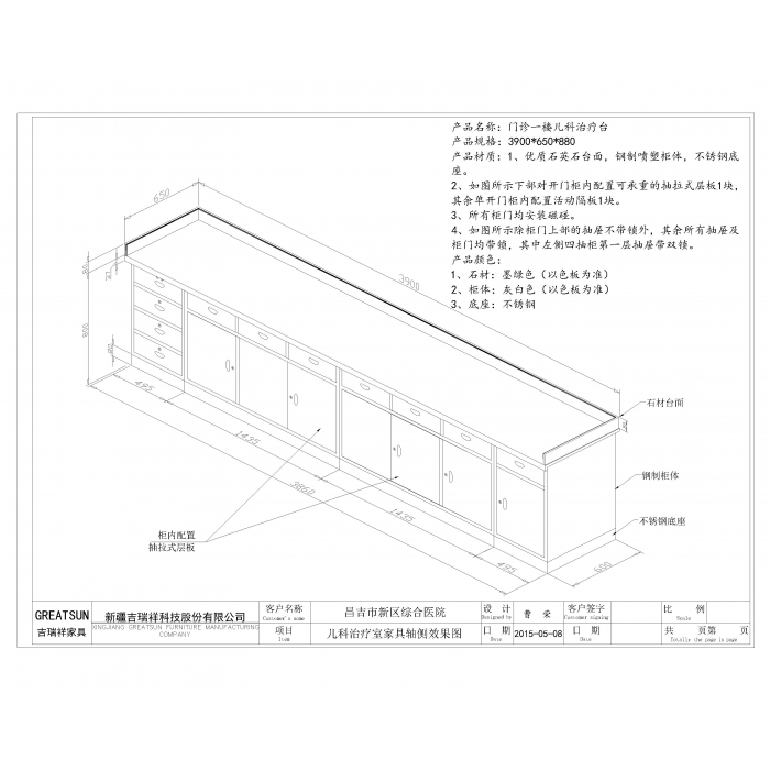 7111940,尺寸:3900*650*880,材质:钢制1.0mm柜体,12mm厚人造石英石,颜色:浅灰、墨绿