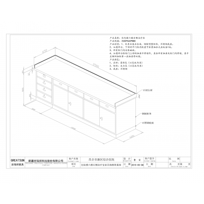 7111942,尺寸:2500*650*880,材质:钢制1.0mm柜体,12mm厚人造石英石,颜色:浅灰、墨绿