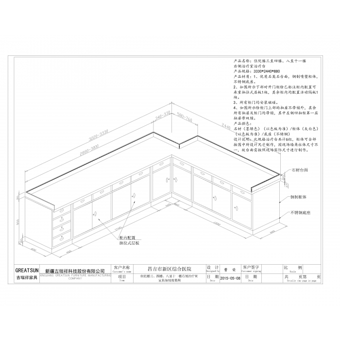 7111943,尺寸:3330*2440*880,材质:钢制1.0mm柜体,12mm厚人造石英石,颜色:浅灰、墨绿