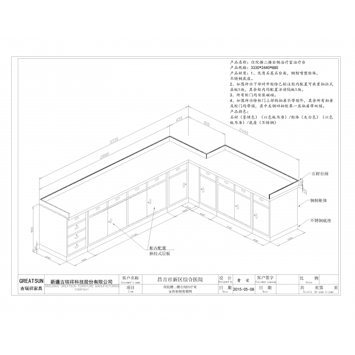 7111947,尺寸:3330*2440*880,材质:钢制1.0mm柜体,12mm厚人造石英石,颜色:浅灰、墨绿