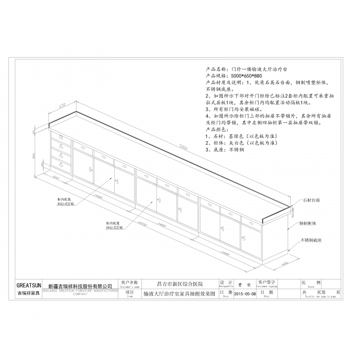 7111953,尺寸:5000*650*880,材质:钢制1.0mm柜体,12mm厚人造石英石,颜色:浅灰、墨绿