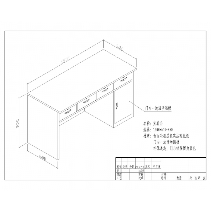7111969,尺寸:1500*650*850,材质:钢制,颜色:蓝色柜子和抽屉,黑色物理桌面