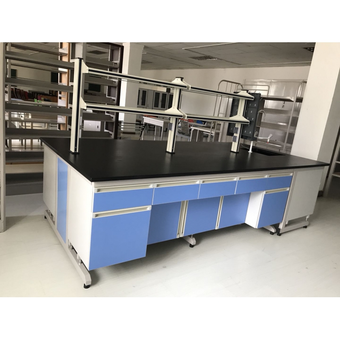 客户需求:1.请参考7112956,需要拼接起来变成一个7米的中央实验台。 2.带试剂架。 3.实芯理化板台面+浅灰色钢制桌架+灰白色三聚氰胺板柜体+蓝色柜门抽屉