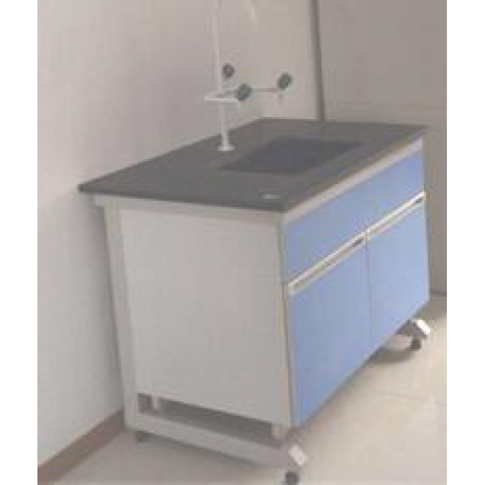 7112944,尺寸:900*750*850,材质:黑色实芯理化板,钢制桌架,灰色柜体,PP水盆,三联水嘴,颜色:黑色桌面、蓝色门板抽面、灰色柜体