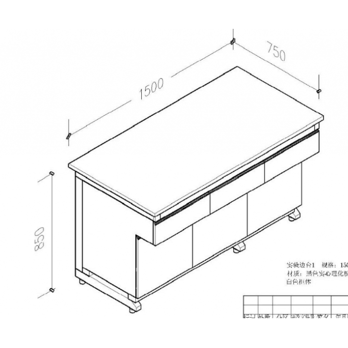 7112948,尺寸:1500*750*850,材质:黑色实心理化板、钢制桌架、蓝色门板和抽面,颜色:黑色桌面、蓝色门板抽面、灰色柜体
