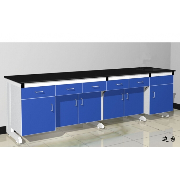客户需求:桌架C型钢结构,桌面贴面理化板,柜体三聚氰胺板,颜色:桌架浅灰色,桌面黑色,柜体灰白色,门板和抽面蓝色。柜体是四扇门。