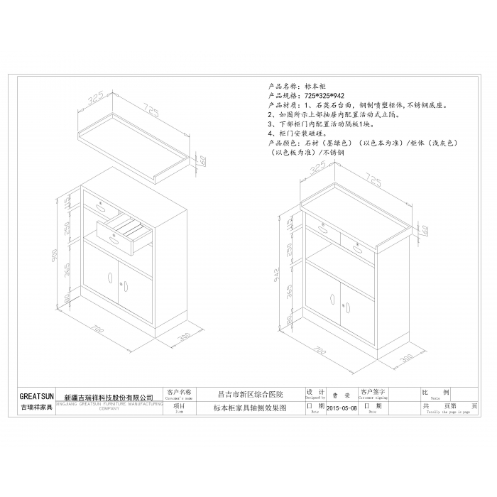 7611975,尺寸:725*325*942,材质:钢制0.8mm柜体,12mm厚人造石英石台面,颜色:浅灰、墨绿