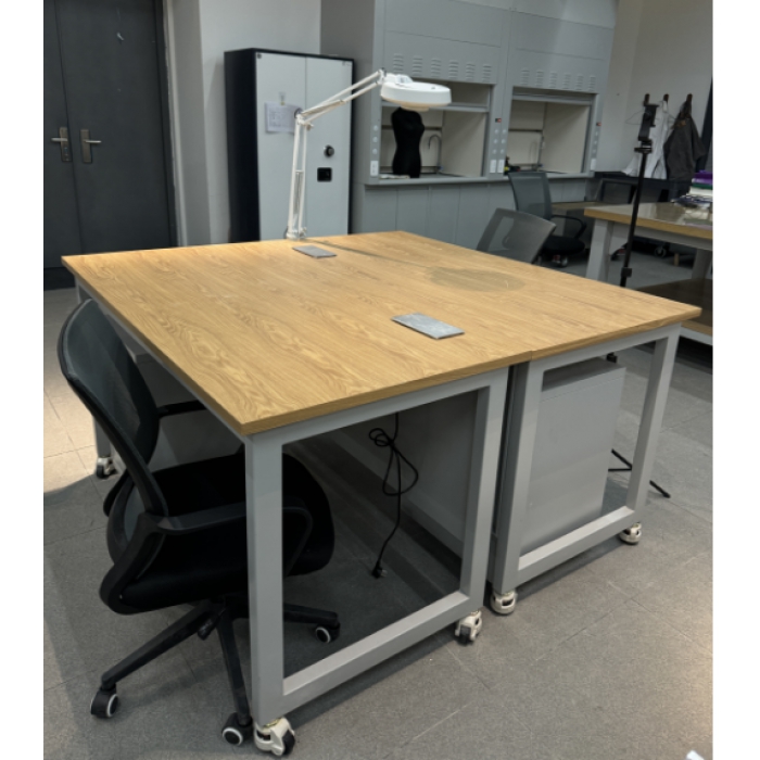 客户需求:1.台面:采用≧18厚实芯国产理化板 2.桌架采用50mm*50mm*1.5mm矩形钢管 3.铝合金脚轮,可调节高低,方便进行设备的移动,调解水平、定位及防震,承重500KG 4.桌面配置水晶膜 5.桌面嵌入式多功能插线板,不少于三组五孔插座电源,带开关功能