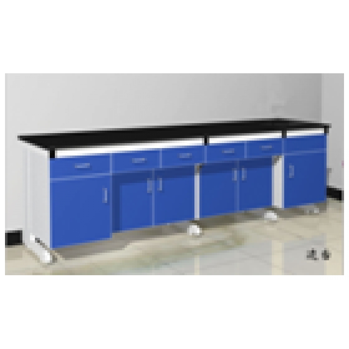 客户需求:桌面12.7mm灰色实芯理化板带加厚边,C型钢桌架,柜体浅灰,柜门、抽面蓝色三氰板。