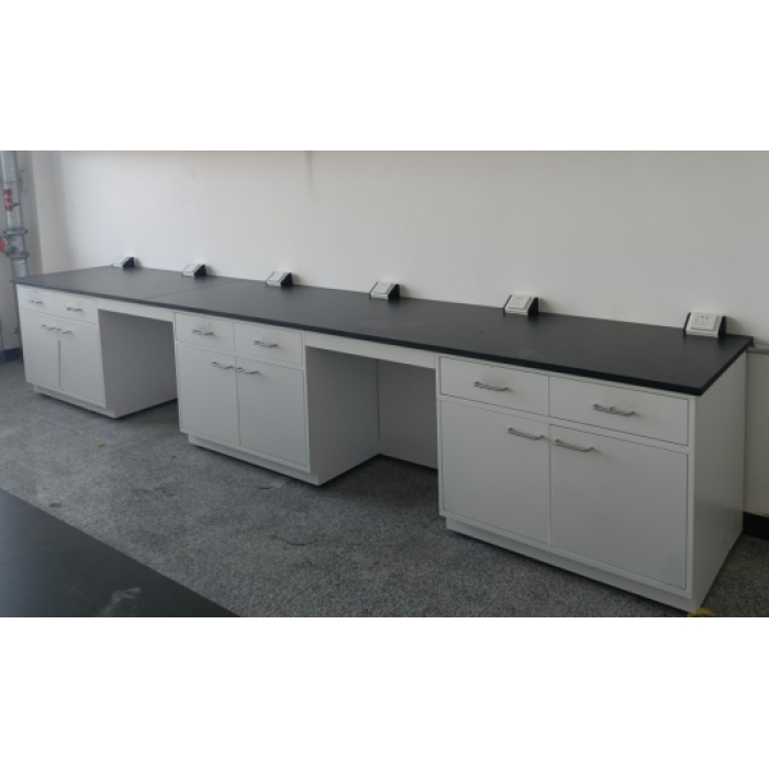 柜体:采用1.0 mm优质冷轧钢板,基材经激光切割数控冲折焊接而成。柜体底板加加强筋,抗变形并且提高柜体整体承重性及抗冲击能力;柜体底部设计凹陷,踢脚板高度为80mm,使柜体整体更佳美观协调。柜体结构采用全钢落地式结构,柜体直接支撑台面,下柜由不同种款式柜体(单抽单门柜、双抽双门柜、空位等)组合而成,背板为可拆卸活动形式,方便拆卸,检修管路,实验台下柜人性化设计,双门柜内可配一层活动隔板,以便放置器材等物。可根据工作需求设计座位空档和主机柜等;