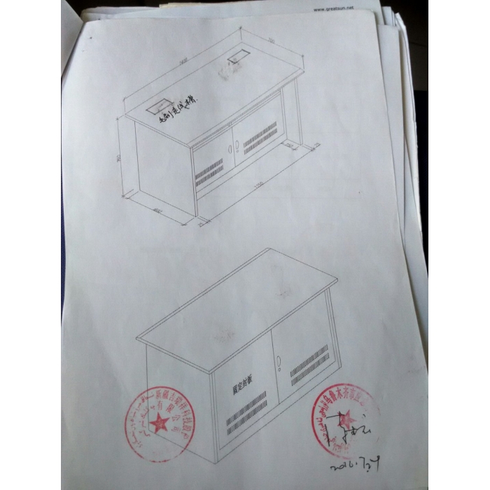 客户需求:注意:(跟前期7111910评审的材质和款式都一样,就是桌面穿线孔换成长方形毛刷穿线孔)制作时桌面下带2个键盘,桌面内部包板子,外部是钢制的,桌面上带留两个长方形毛刷穿线孔,桌底板留2个穿线孔,柜体前面对开门带1把锁,背面带1把锁,前后都留有通风口,制作时板材是1.0的,桌面鸭嘴边。请尽快评审。谢谢!
