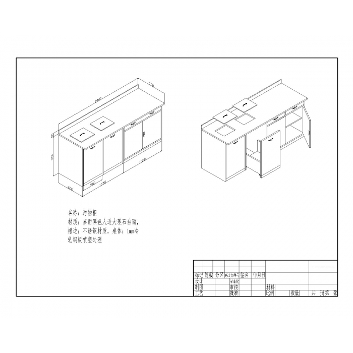 客户需求:污物柜做法:台面为人造大理石,下部一侧设置可移动托板,在托板上部制作钢制固定骨架,同时正立面按照柜体面板制作安装(下部安装四个熟胶万向轮),放置污物桶移动托板推车两部,为一抽单开2个,另一侧上部设置两抽,下部设置双扇平开门,门内设置一块可调节隔板,污物桶台面开启正方形15cm污物投放口。 人造大理石台面下采用厚度18mm三聚氰胺板做垫层。 柜体底部均设高度为10cm不锈钢裙边。