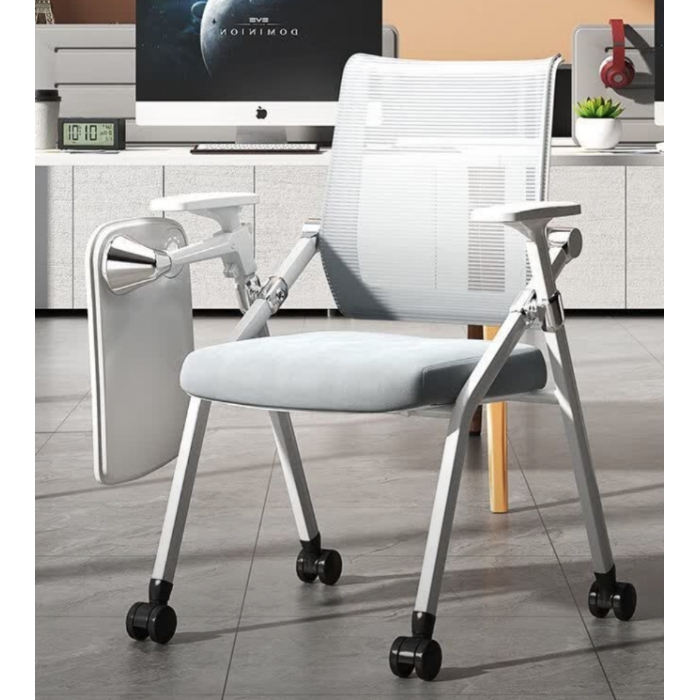 客户需求:1.整体尺寸(mm):W640*D580*H860,写字板整体尺寸(mm):W400*D250,(允许偏差范围:±5mm)。 2.写字板面上设计有水杯槽和笔槽。椅背采用尼龙背框扪弹性透气加密网布。椅背连接件材质为铝合金,提供倾仰功能。座板采用定型棉扪优质加密弹性绒布,椅座可以折叠。椅架采用异型管材,厚度≥1.5mm。