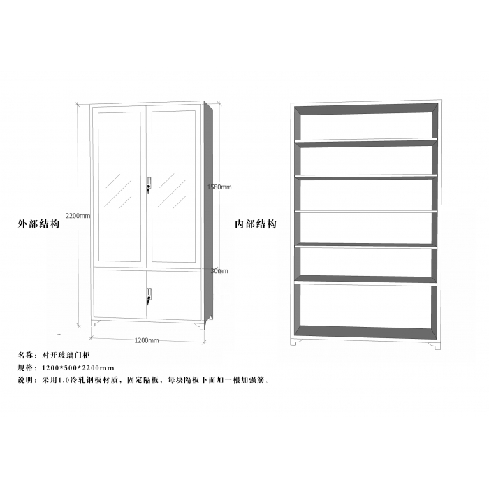 客户需求:注:柜玻璃门部分里面隔板都为固定隔板且需加强筋,确保上面隔板与隔板内孔尺寸为300mm,剩下的为下部分其余按图纸