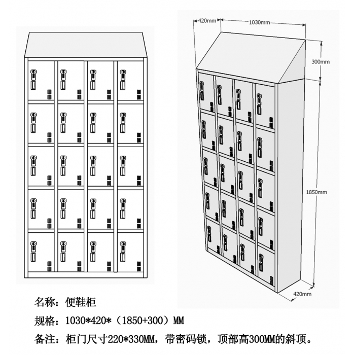 客户需求:20门、带300mm斜顶、铁皮1mm、带密码锁、柜门尺寸220*330mm