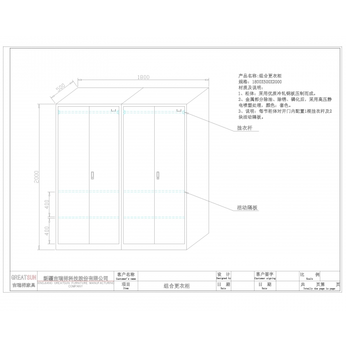 9311384,尺寸:1800*500*2000,材质:钢制0.8mm,柜内两块活动隔板,一根挂衣杆,颜色:浅灰