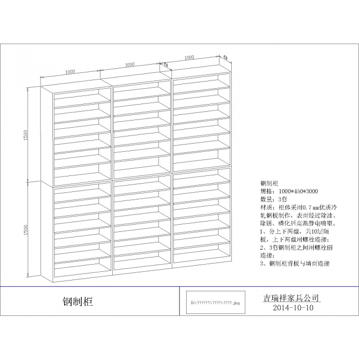 客户需求:1、特制柜分上下两节,需要用螺丝连接。共计10层隔板。 2、3套特制柜之间侧板需要用螺栓连接,钢柜背板与墙面用膨胀螺丝固定,保证安全。