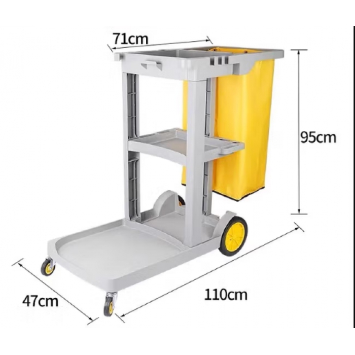 客户需求:尺寸:1120cm*510cm*1000mm 整体采用工程塑料或者金属框架,有前置水桶位置,大容量立即收集袋,三层置物采隔板,两侧工具插杆槽·推车底部有万向轮